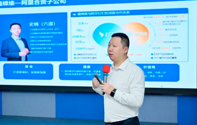 在座谈会上,鑫蜂维董事长史楠首先向来访嘉宾表示热烈欢迎,并简要介绍了公司的发展历程、与钉钉的共创史,以及公司的主营业务和六大合作板块。这些板块涵盖了数字化安全生产事故预防治理、企业数字化转型、教育赋能、数字人才培训、本地生活服务及算力服务等多个领域,为各类企业与政府机构提供了全方位的支持与解决方案。
