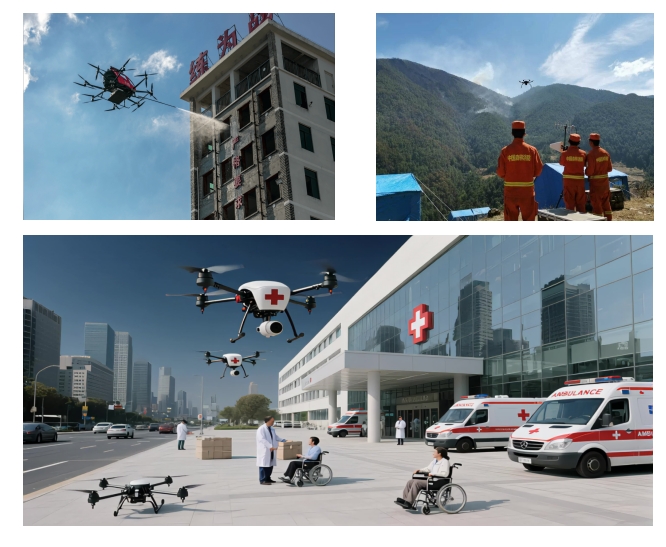 应用场景:医疗救援及地震、洪水等灾害现场勘察(实时画面回传、被困人员定位)、森林火灾监测(火势蔓延分析、灭火物资投送)、海上搜救(红外探测、应急通信中继)。